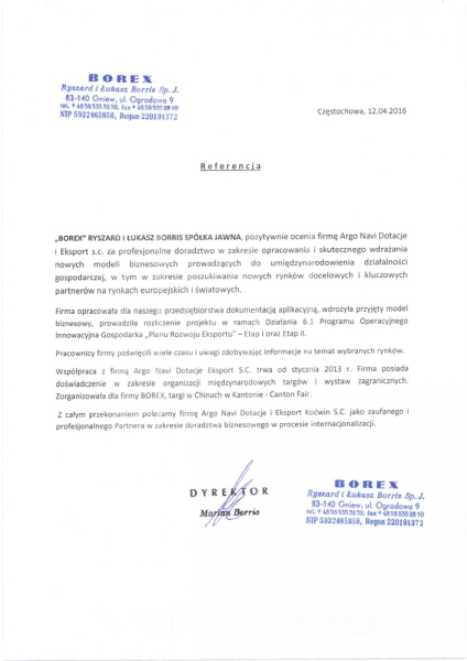 Referencje od firmy: BOREX RYSZARD I ŁUKASZ BORRIOS Sp.J.