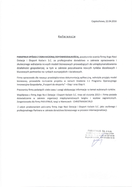 Referencje od firmy: PARAFINUS Sp. z o.o.
