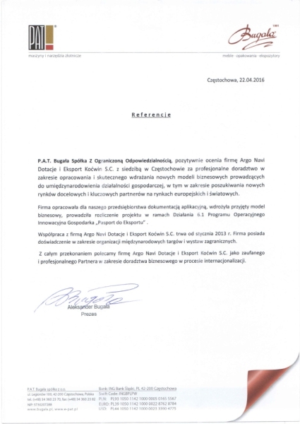 Referencje od firmy: P.A.T. Bugała Sp. z o.o.